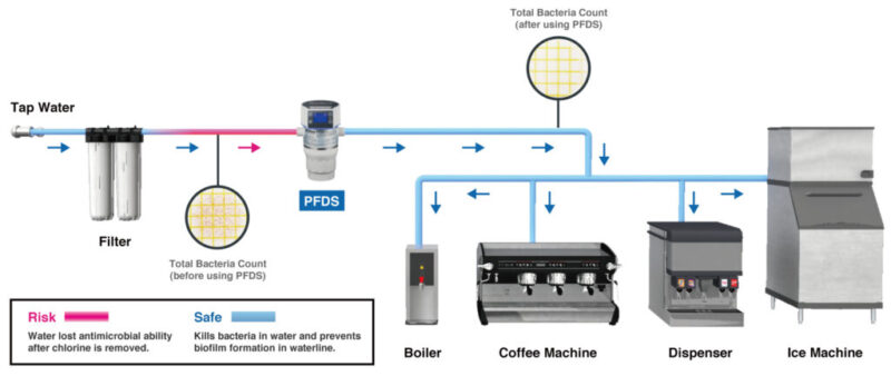 Each week, it is recommended that any tubes supplying beverages be disconnected and thoroughly sanitized. This can be done by switching the water source to the ozonated water pipeline supplied by the PFDS series. Fill the entire pipeline and the equipment with ozonated water through the water discharge of the equipment, and switch the water source back to the beverage dispenser after the sanitation is completed.